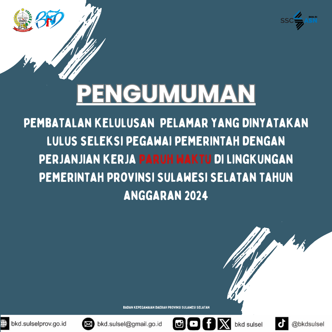 Pengumuman Pembatalan Kelulusan Pelamar yang dinyatakan Lulus Seleksi Pegawai Pemerintah dengan Perjanjian Kerja Paruh Waktu diLingkungan Pemerintah Provinsi Sulawesi Selatan Tahun Anggaran 2024