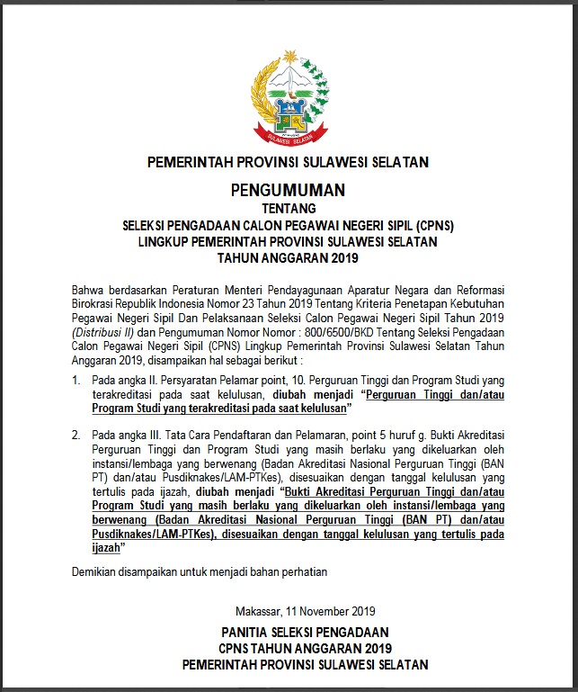 Makassar - Pengumuman Seleksi Calon Pegawai Negeri Sipil (CPNS) lingkup Pemerintah Provinsi Sulaw...